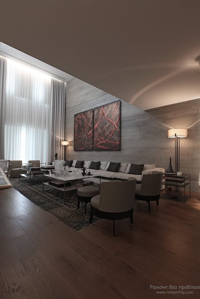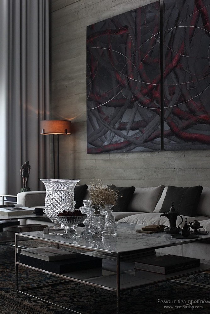 Для усиления эффекта театральности в интерьере хорошо использовать гладкие и зеркальные поверхности, а также различные блестящие ткани, предметы из хрусталя, серебра и золота. Относительно оптимальных пропорций для оформления гостиной в темных тонах – должно присутствовать по 2 части темного и среднего оттенка и одна часть светлого. Темный цвет идеально подойдет для мебели и пола, средний тон – для стен, а светлый идеален для потолка и аксессуаров.