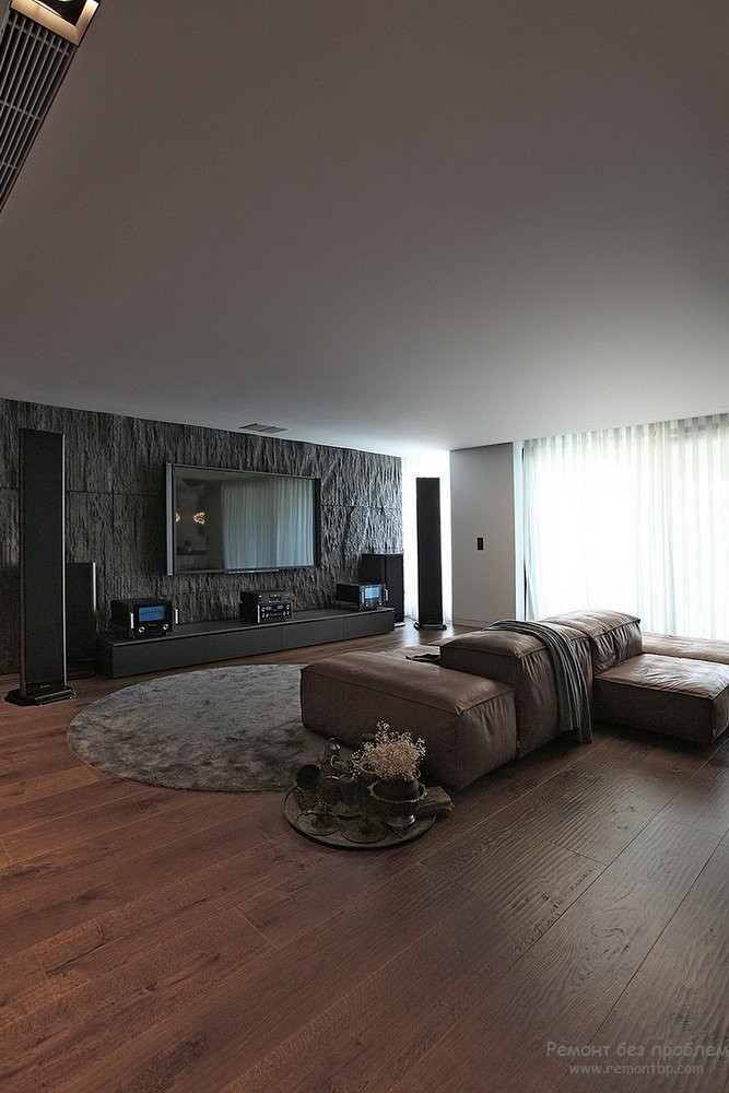 Немаловажно правильное освещение. Кстати, создание темного интерьера возможно только в том случае, если окна гостиной достаточно большие и выходят на солнечную сторону, т.к. данный интерьер требует большого количества света большую часть дня. Относительно искусственного освещения можно сказать то же самое – его также должно быть много, а еще оно должно быть хорошо продуманным.