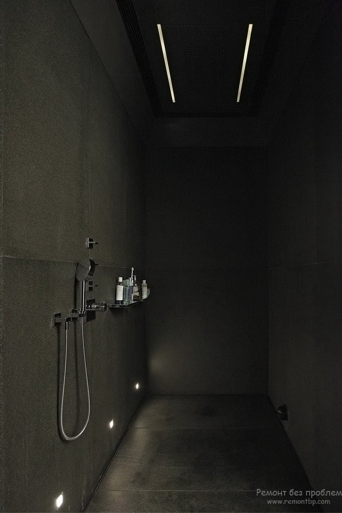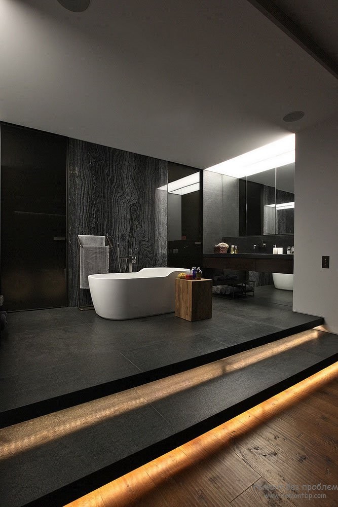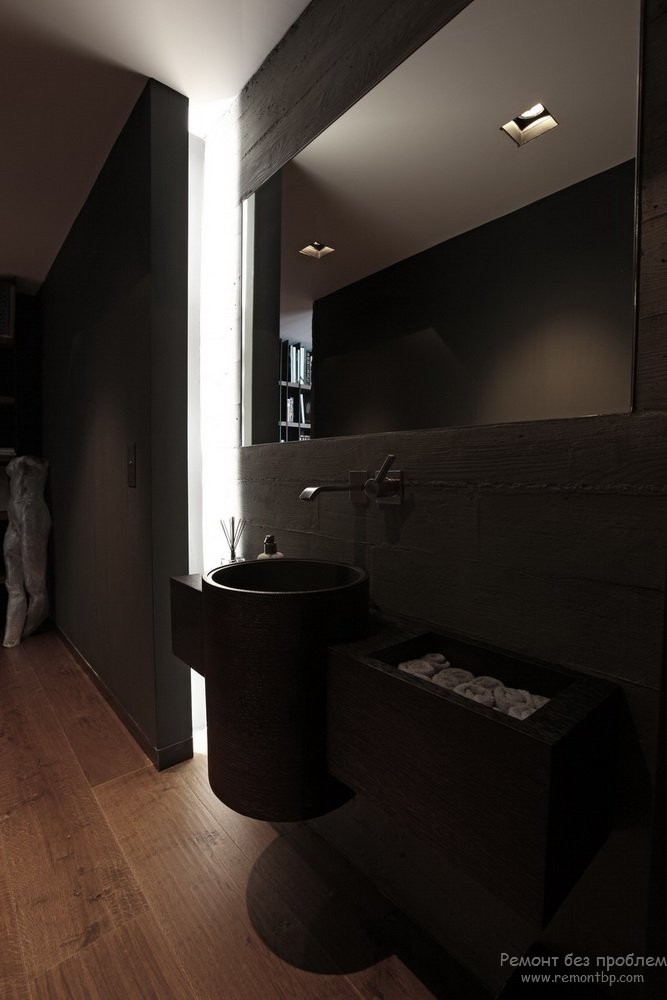 Дизайн ванной комнаты в темных тонах должен быть тонким. Здесь очень важно чувство меры и вообще буквально каждая деталь. Например, стены с рисунком в виде тонких продольных брусочков зрительно увеличат пространство, желательно наличие изящной элегантной сантехники. А если саму ванну выложить так же, как и стены, то получится полная гармония. Вообще наличие черного цвета в ванной всегда придает ей необычности и эксклюзивности, превращая ее в очень стильное помещение.