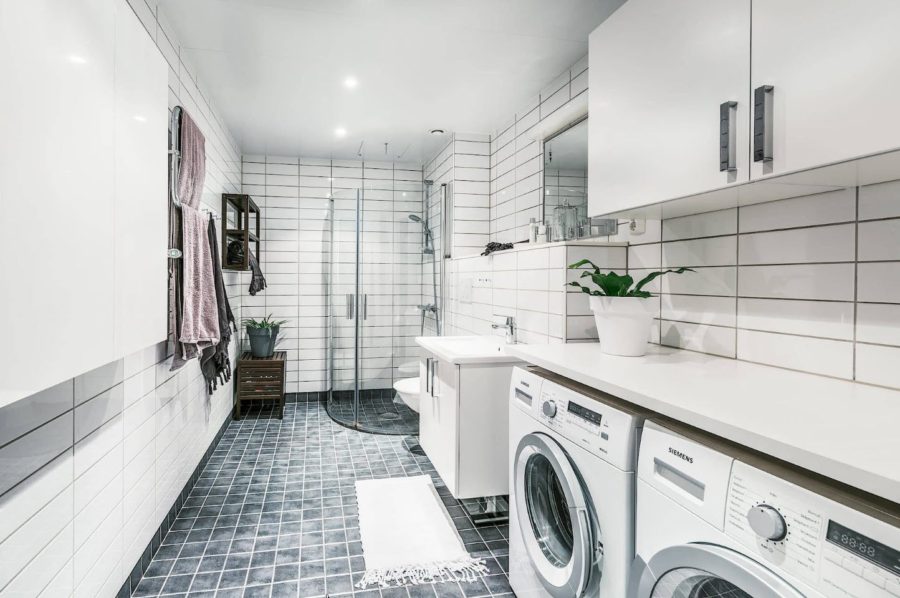 Если пространство действительно мало, стиральная машина может быть установлена в углу или встраиваться в готовый корпус, сделанный из гипсокартона и керамической плитки для облицовки или ДПК. Тогда устройство будет идеально соответствовать дизайну интерьера, гармонично вписываясь в стилистическое оформление пространства.