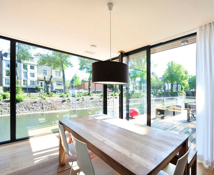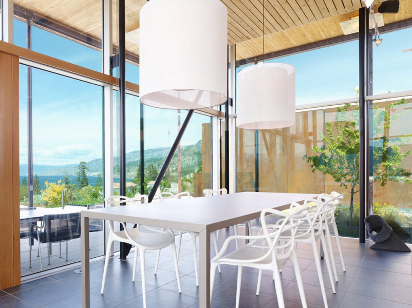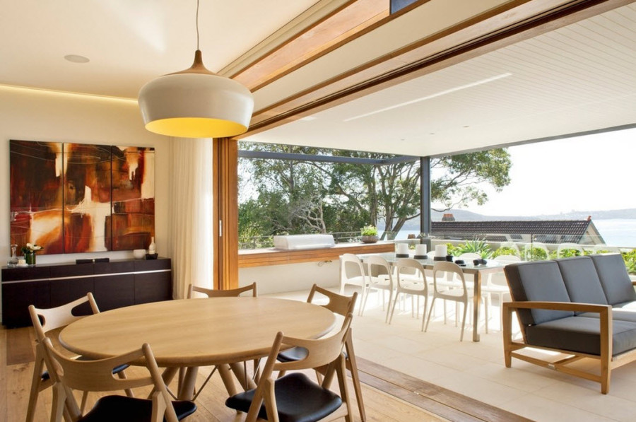 Оконные проемы в современной столовой не ограничены в площади. Это могут быть и окна во всю длину стены, при этом конструктивно они могут иметь переплеты, или это может быть представлено в виде стеклянной стены.