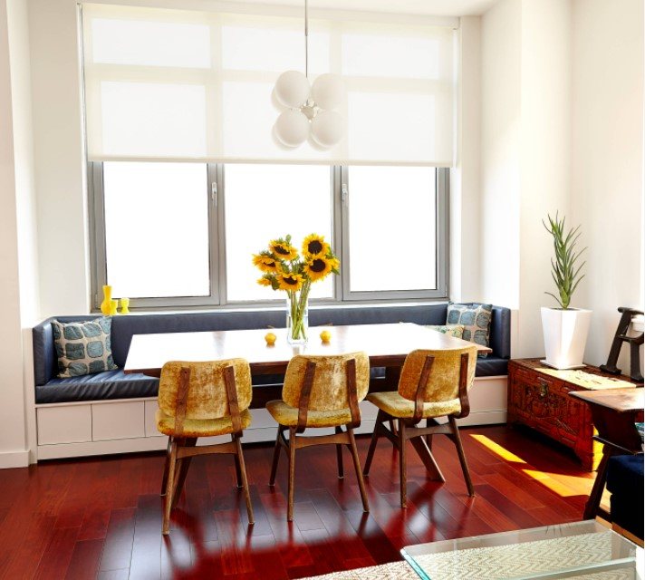 Идеально подойдет для маленькой гостиной стол-трансформер в сочетании со складными или штабелируемыми стульями. Трансформеры, в свою очередь, имеют различные способы трансформации: раздвижной (две части стола раздвигают для вставки дополнительной столешницы), складной (знакомый всем с детства стол-книжка), откидной (столешницу закрепляют на стене, при необходимости опускают на складную ножку).