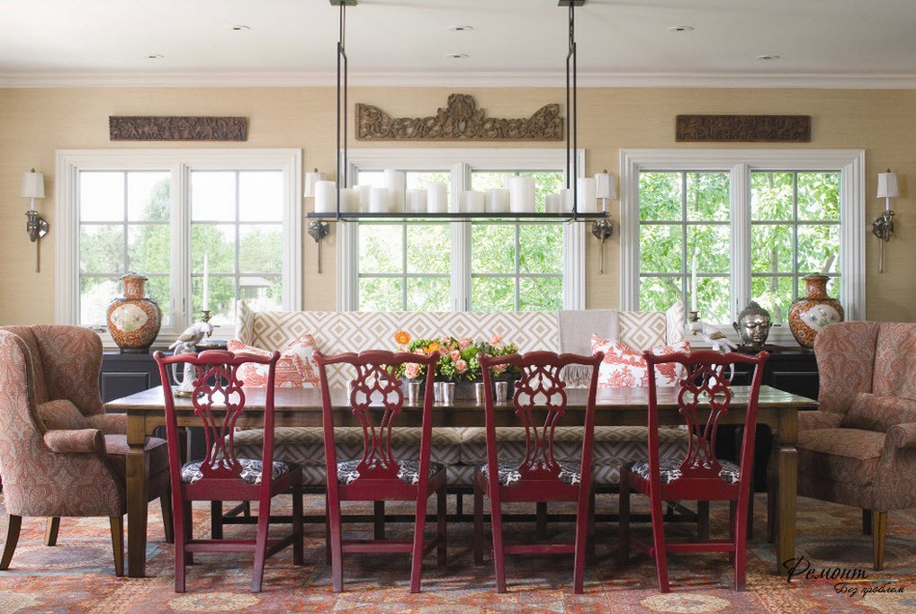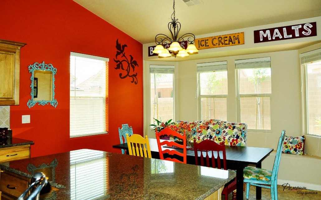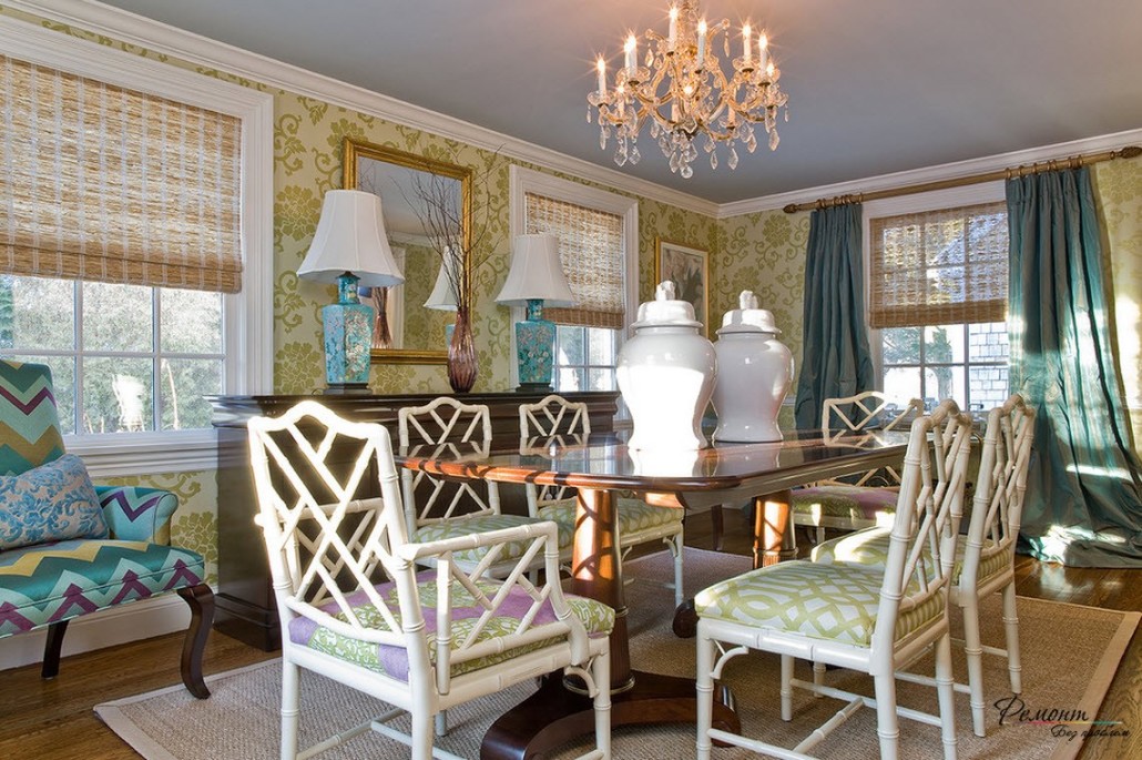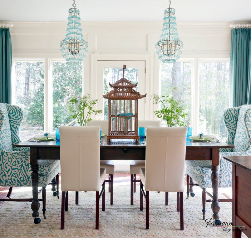 Решив рискнуть и обратиться к яркой цветовой палитре, можно дать полную волю своей фантазии. Даже оформляя весь дизайн, придерживаясь правила «трёх цветов», стулья можно полностью вырвать из общего контекста, сделав их самыми яркими и самыми броскими элементами интерьера. Разбавляя общий колорит, каждый стул может стать уникальным, обретя свой цвет и свой узор. Главное экспериментировать умело, не перебарщивая с различными цветами и оттенками, если основной акцент будет сделан именно на стульях.