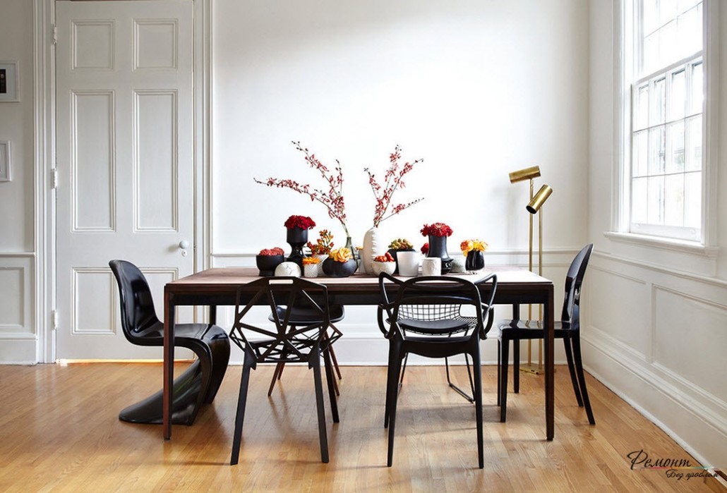 Когда речь заходит о месте приёма пищи, стулья становятся ключевым элементом интерьера, уступая в первенстве лишь столу. Выбирая стулья для столовой, стоит учитывать размеры комнаты и стола, который подобрал дизайнер. Количество стульев не всегда обязано равняться количеству людей, живущих в этом доме или в квартире. Главное, чтобы комната не была нагромождена мебелью, а для нескольких нежданных гостей всегда нашлось место. При расстановке стульев возле прямоугольных или квадратных столов стоит придерживаться правил симметрии, выделяя лишь стулья, установленные «во главе».
