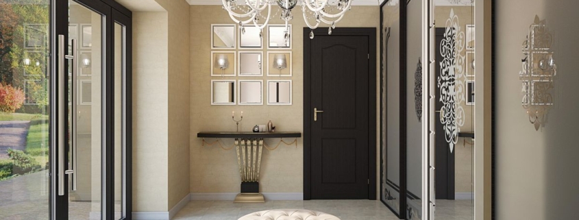 Зеркала в интерьере прихожей – это довольно распространённое решение. Поэтому при использовании подобного аксессуара следует обязательно позаботиться о его дополнительной подсветке. Высоко расположенное зеркало освещается группой небольших светильников по бокам или в верхней части. Для прихожих с небольшой площадью актуально использовать один большой источник освещения, расположенный по центру потолка. Если же зеркало является непосредственной частью шкафа-купе, следует установить осветительные приборы в подпотолочную консоль, находящуюся над ним.