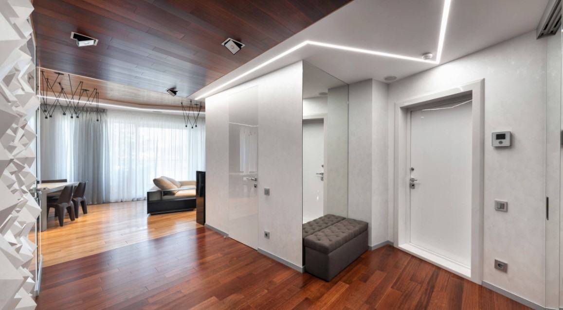Как правило, большинство прихожих имеют нестандартную форму, и перед хозяевами жилплощади стоит очень сложная задача – создать одновременно уютную атмосферу, расширить помещение и максимально осветить основные функциональные зоны прихожей. В первой зоне, около входной двери, как правило, размещается вешалка и обувница. Здесь мы снимаем и надеваем верхнюю одежду, переобуваемся и встречаем гостей. Поэтому и дополнительная подсветка в этой части просто необходима.