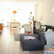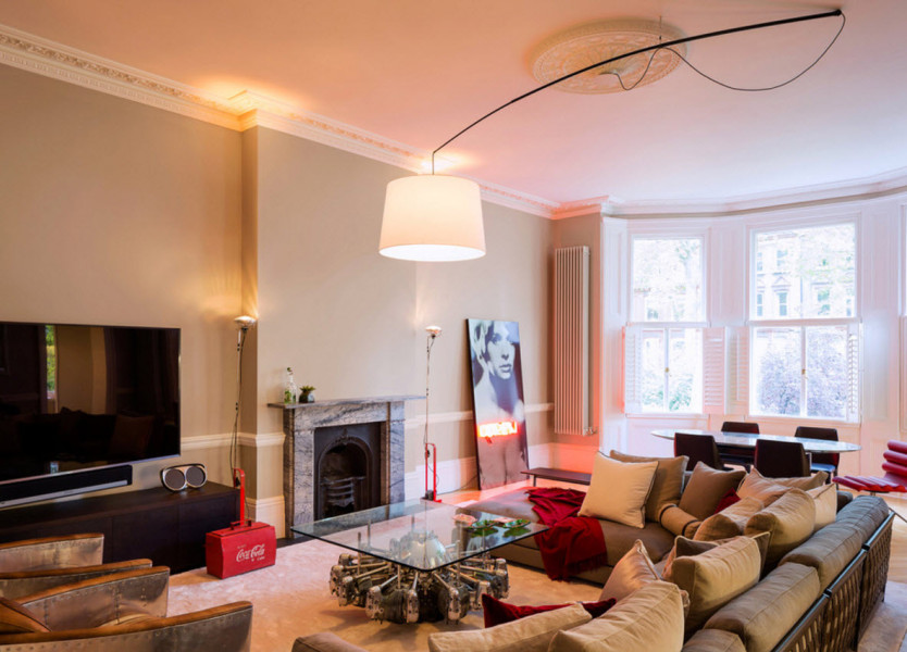 Невероятным образом комната становится едва узнаваемой, после установки мебели и декора. Контрастные сочетания и оригинальные фактурные решения создают нетривиальную, но при этом комфортную обстановку для отдыха всей семьей и приема гостей. Между зоной гостиной и столовой нет никаких преград – благодаря открытой планировки помещение не теряет своего ощущения свободы и простора, несмотря на достаточно высокую загруженность меблировкой и предметами декора.