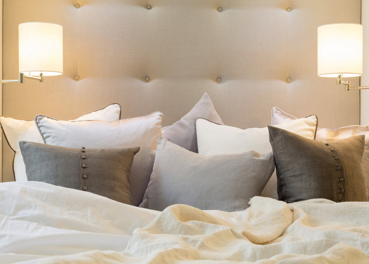 Вопрос создания приятной освещенности в спальне решен оригинальным способом – настенные светильники с блестящими плафонами крепятся к мягкому изголовью кровати. Такая установка позволяет не занимать место на прикроватных тумбочках под настольные торшеры и при этом создавать достаточный уровень освещенности для времени перехода ко сну или чтению в кровати.