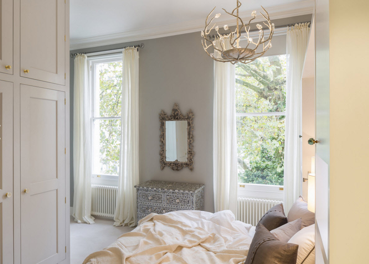 Оригинальный дизайн подвесной люстры перекликается с мотивами исполнения рамы для зеркала, расположенного над необычным расписным комодом. Подобные элементы меблировки и декора привносят в строгий вид помещения нотки волшебства. Сказочные мотивы в интерьере комнаты для сна и отдыха могут не зависят от возраста хозяев помещения.