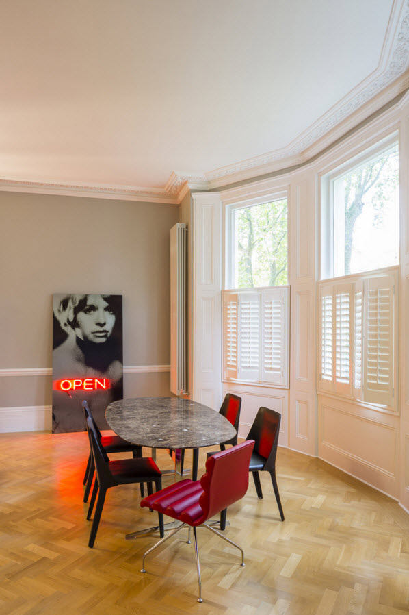 Столовая зона также представлена контрастным выбором меблировки. Стол для трапез был выбран по форме эркера, в котором расположена обеденная группа, его каменная столешница перекликается видом материала с облицовкой камина, создавая гармоничное сочетание двух функциональных зон, размещенных в рамках одного помещения. Четверка удобных стульев со спинками дополнена мини-креслом с ярко-бардовой кожаной обивкой. Всего лишь один колоритный элемент в этом функциональном сегменте поднимает градус всего образа столовой зоны.