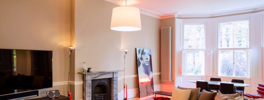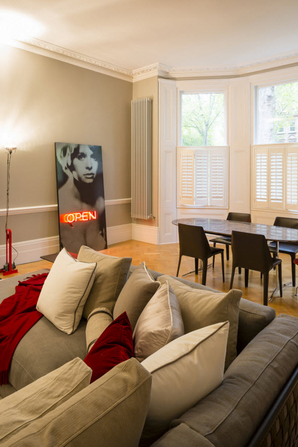 Как наполнить яркостью интерьер помещений, отделка которых выполнена в светлых, нейтральных тонах? Проще всего сделать это с помощью оригинального и колоритного декора – яркий текстиль для диванных подушек в гостиной или покрывала в спальне, необычные осветительные приборы и даже винтажные вещи ярких оттенков. Предлагаем вашему вниманию дизайн-проект апартаментов, при оформлении которых была найдена золотая середина в создании спокойной, но при этом нетривиальной атмосферы жилых пространств. Начнем наше знакомство с современным частным жилищем с самой просторной комнаты – гостиной, которая совмещает в себе и функции столовой. Помещение с эркером оформлено в светлых тонах – белоснежный потолок, украшенный по периметру лепниной, переходит в светло-серые стены с белыми молдингами и широким плинтусом, завершает отделку паркетный пол из светлой древесины. Лишь темное пятно камина, облицованного камнем, выделяется в этой светлой идиллии.