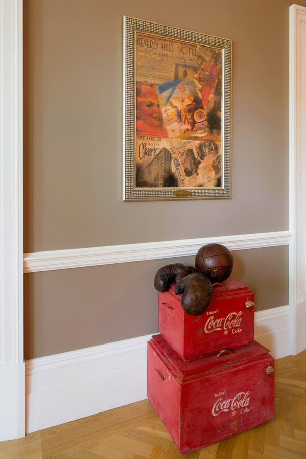 Еще одной отличительно особенностью оформления помещений в городских апартаментах становится применение винтажного декора – картины из плакатов прошлого столетия и оригинальное использование фирменных ящиков в качестве систем хранения, позволяет не только привнести нотки оригинальности в дизайн гостиной, но и создать повод для приятных воспоминаний.