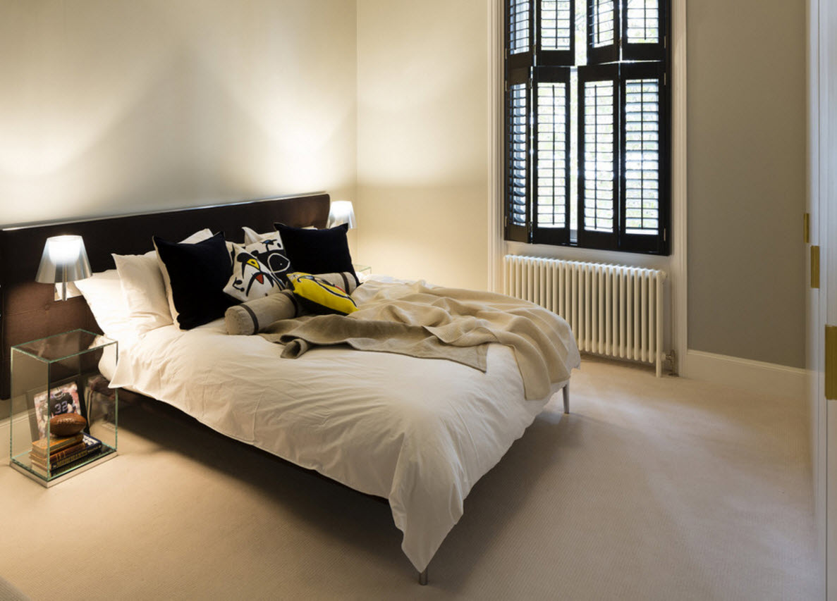 Из помещений общего пользования переходим в приватные комнаты. Первая спальня представляет собой скромное по размерам, но контрастное по оформлению помещение. Отделка комнаты для сна и отдыха во многом повторяет оформление гостиной, но в этом пространстве вопрос создания контрастности решен с помощью весьма темных оттенков. Практически черные ставни, изголовье кровати и декоративные подушки становятся акцентными пятнами в светлой палитре пространства.