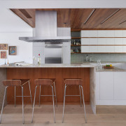 Раздвижные стены в полную высоту соединяют зоны, находящиеся снаружи с внутренними помещениями, делают границы между ними практически неразличимыми и служат для защиты интерьера от неблагоприятных погодных условий – дождя и ветра. Широкое использование остекления используется и внутри дома, чтобы создать визуальную связь между отдельными участками пространства.