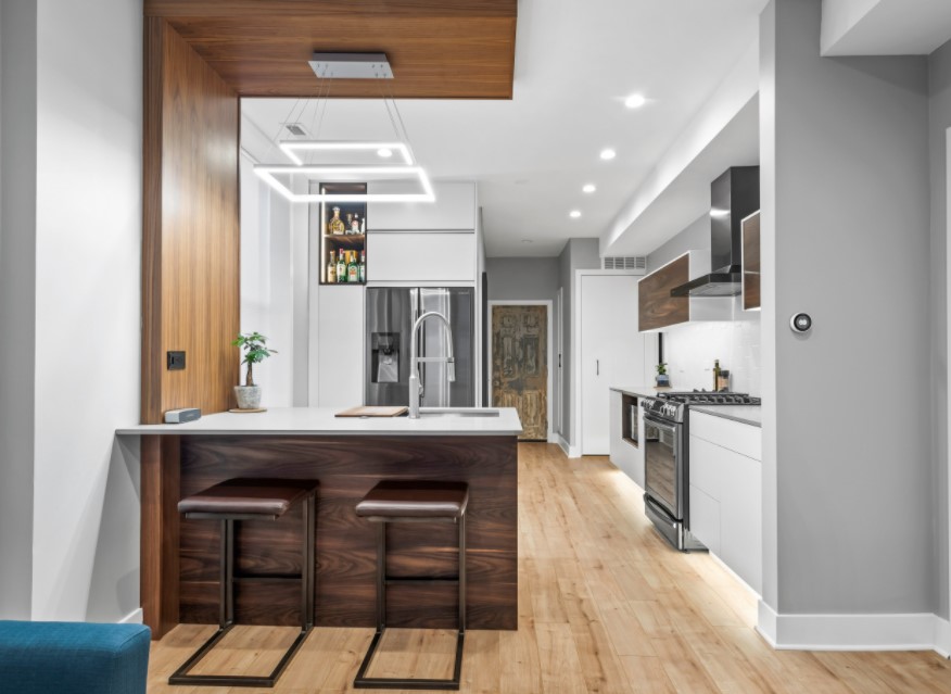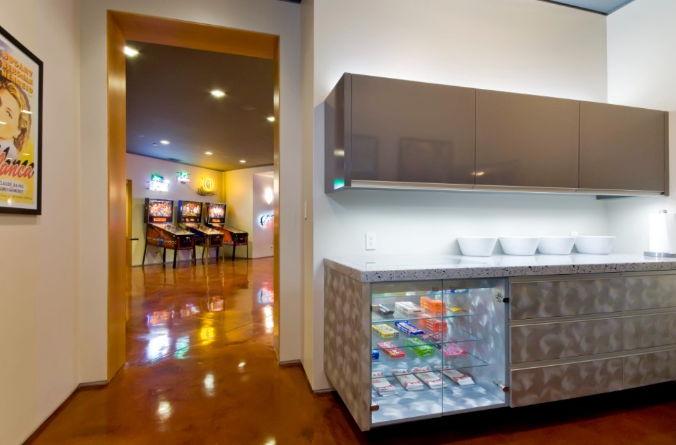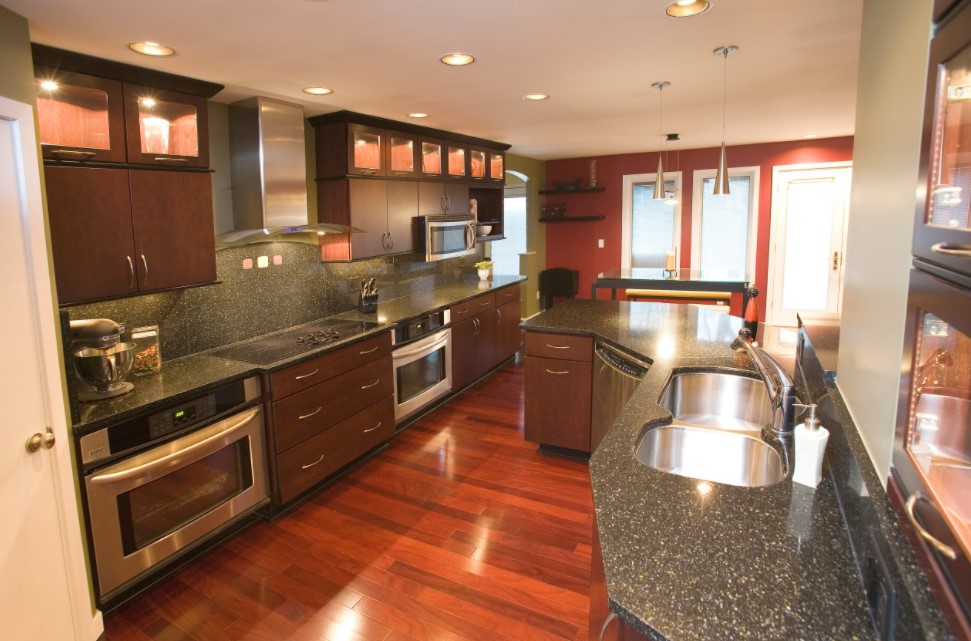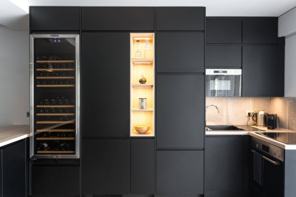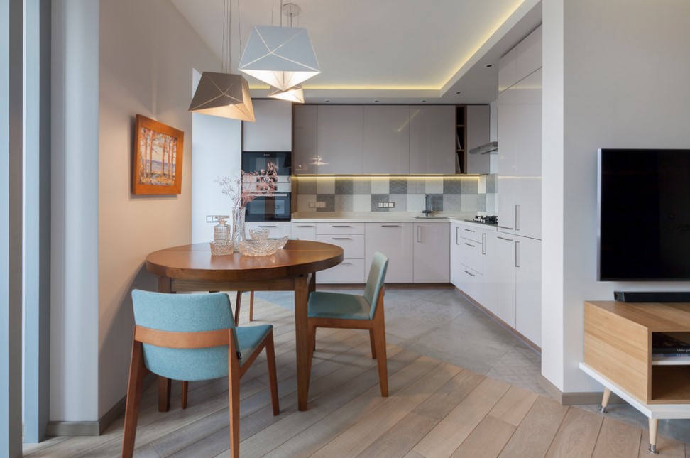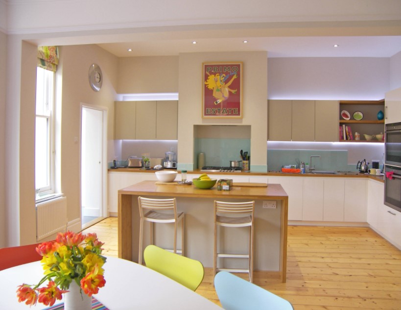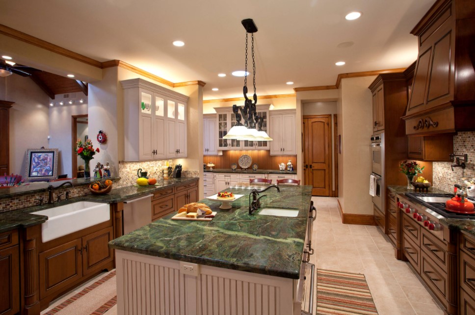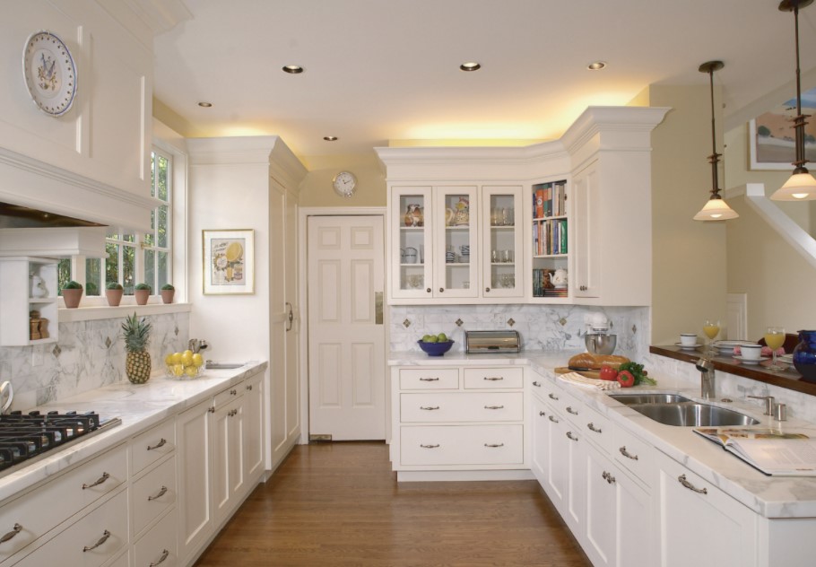 Встроенные светильники идеально подойдут для кухни, точечные чаще всего используют при подсветке внутренней части шкафов, а также в рабочих кабинетах.