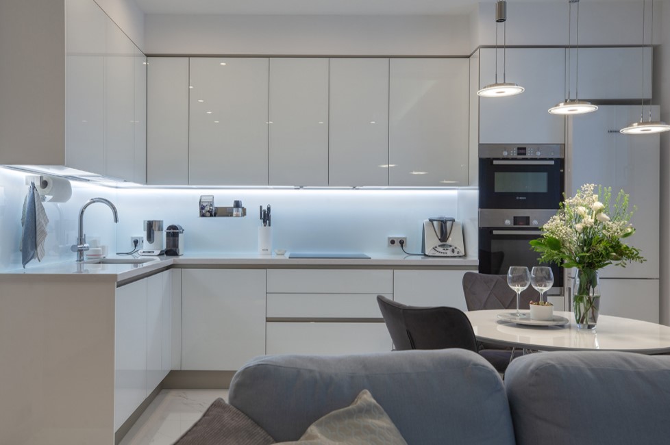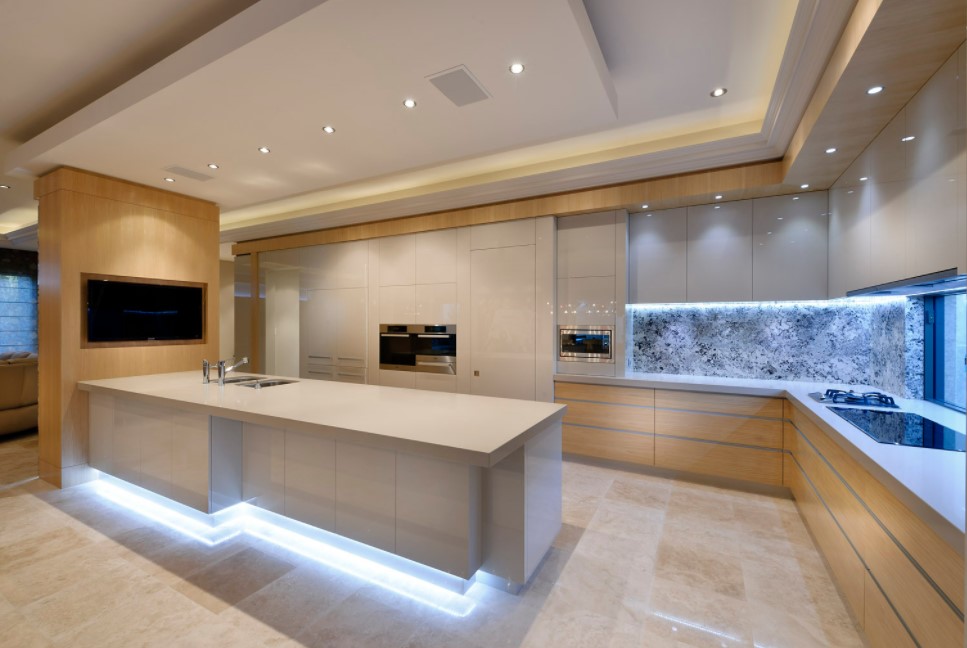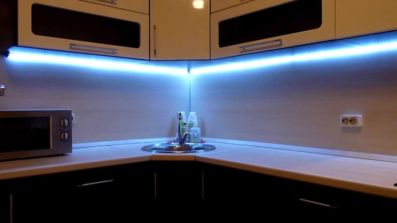 Прикрепляются элементы подсветки традиционно сверху, но возможно расположение сбоку или снизу. Иногда подсветку монтируют в плинтусе, но это спорный вариант. При подсветке снизу не станет светлее рабочая или другая функциональная зона и будут видны мельчайшие частицы мусора и пыли.