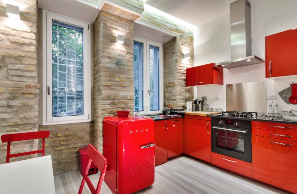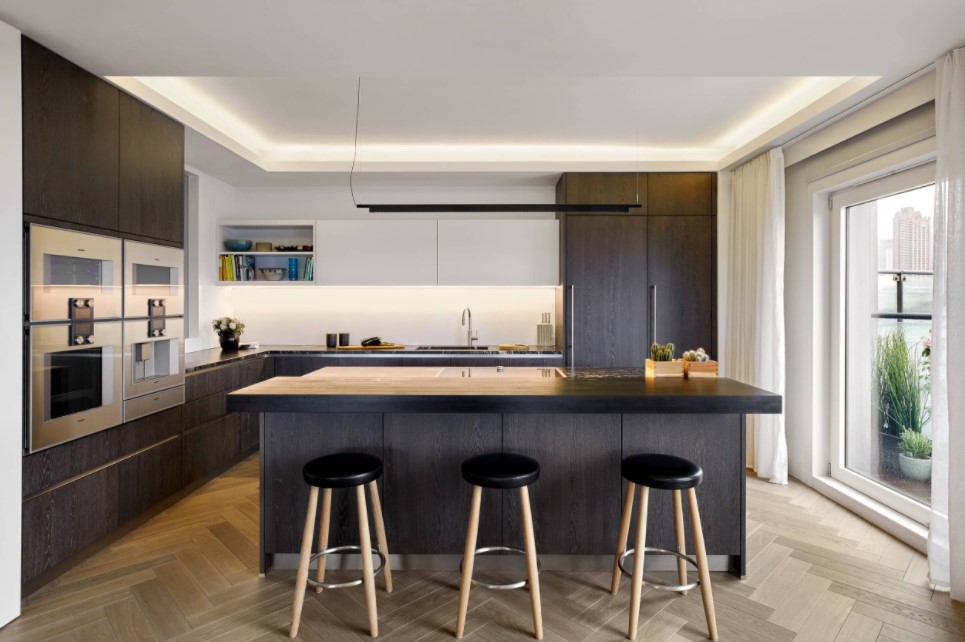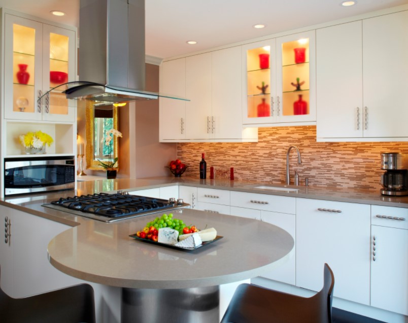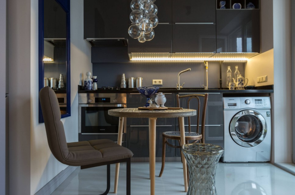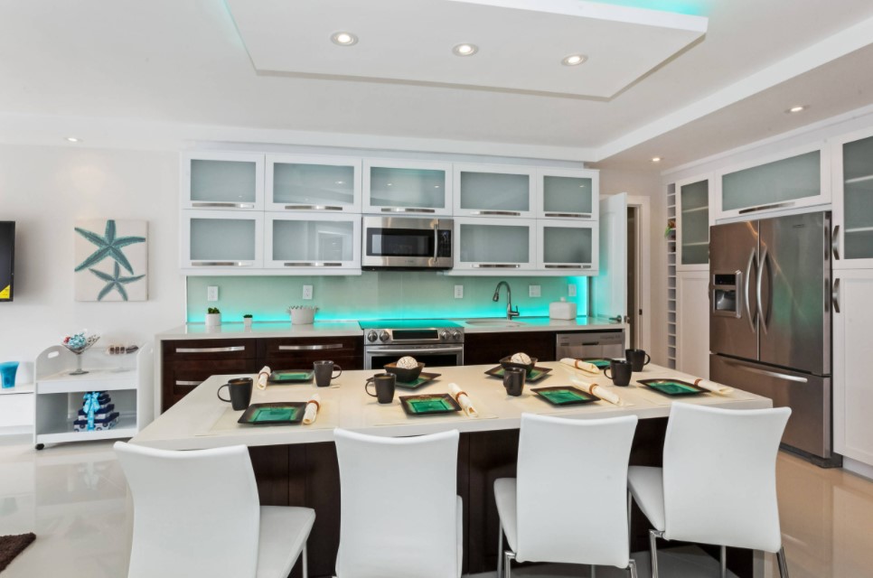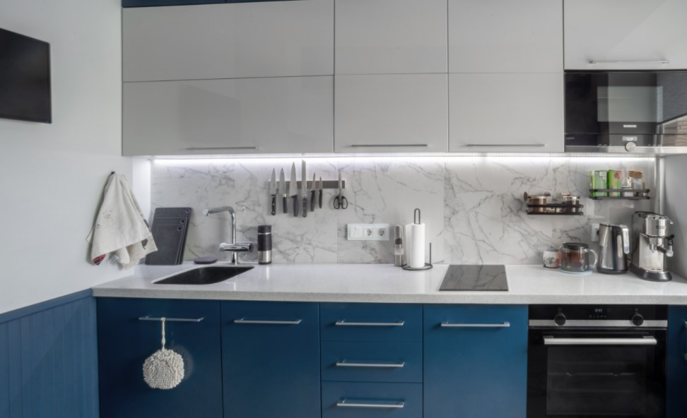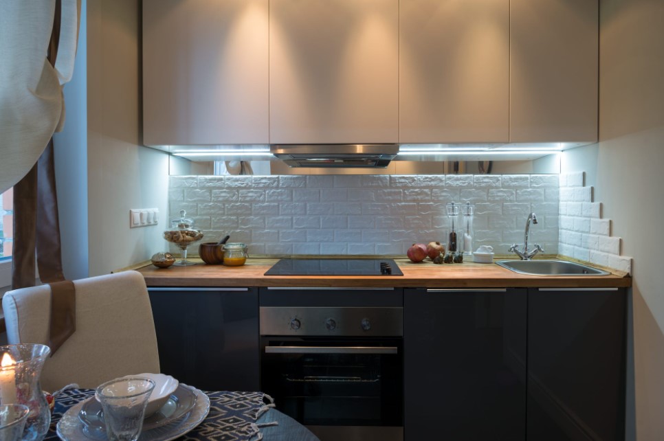 Возможно размещение светодиодных светильников или ленты по фартуку, которое будет носить в основном декоративный характер, выполняя функцию дополнительного освещения столешницы.