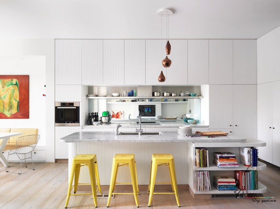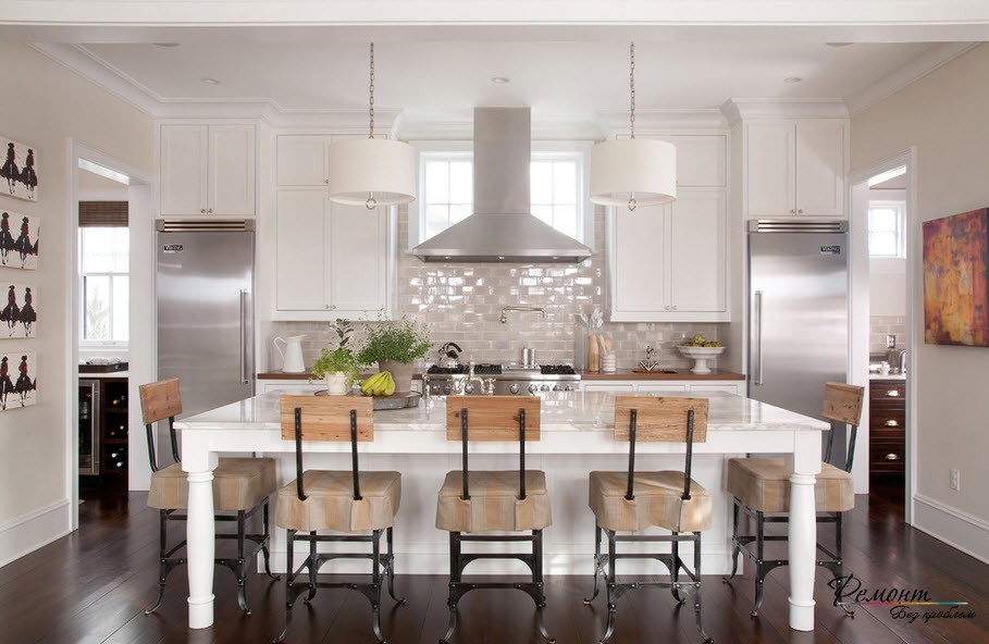 Важно учитывать высоту самого острова, т.к. она несколько выше стандартного обеденного стола. В этом случае уместно использовать барные стулья, которые позволят избежать неудобств: