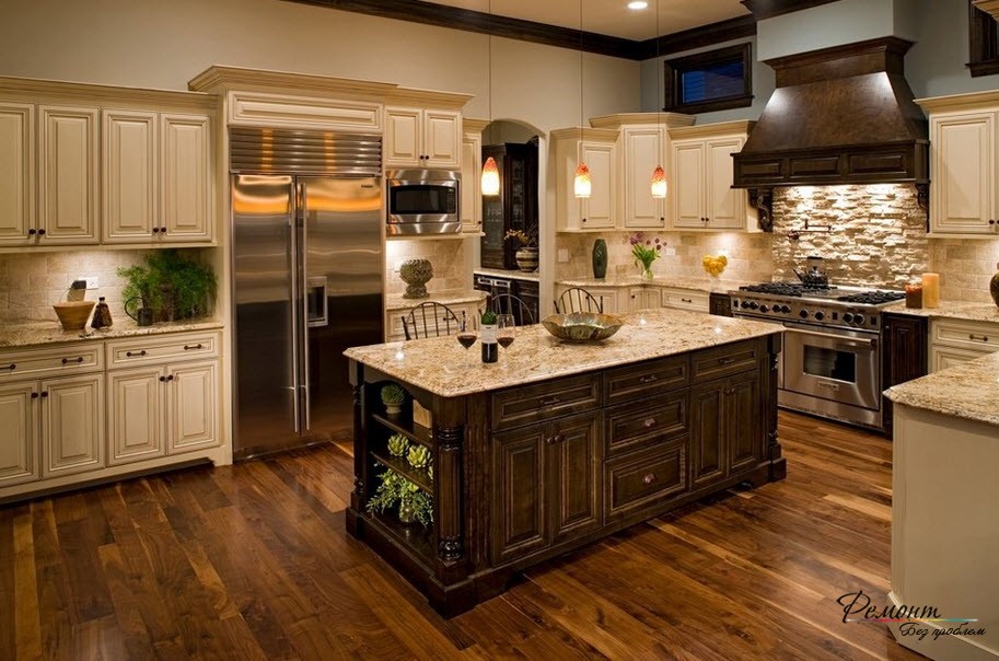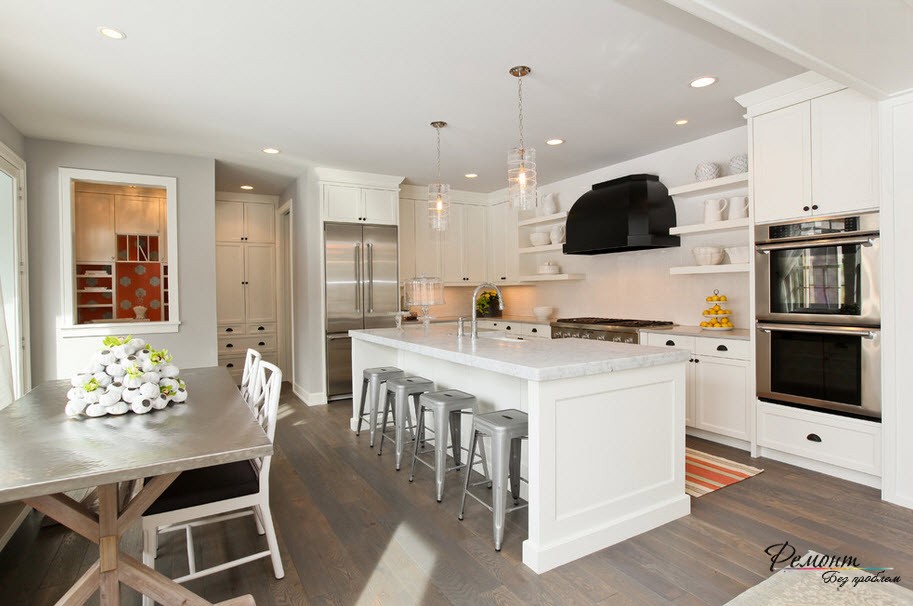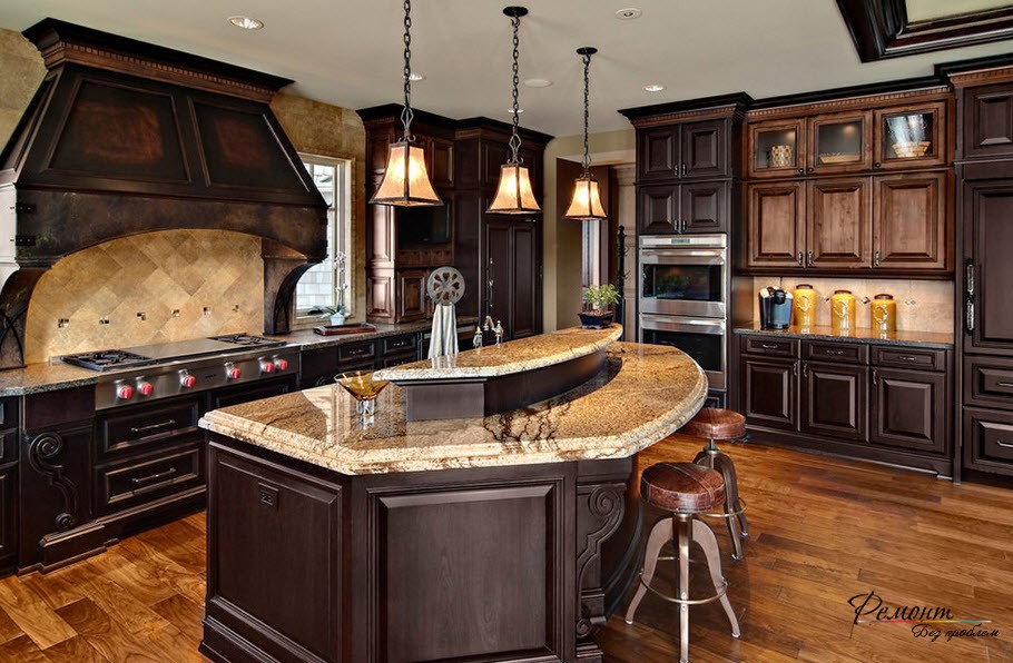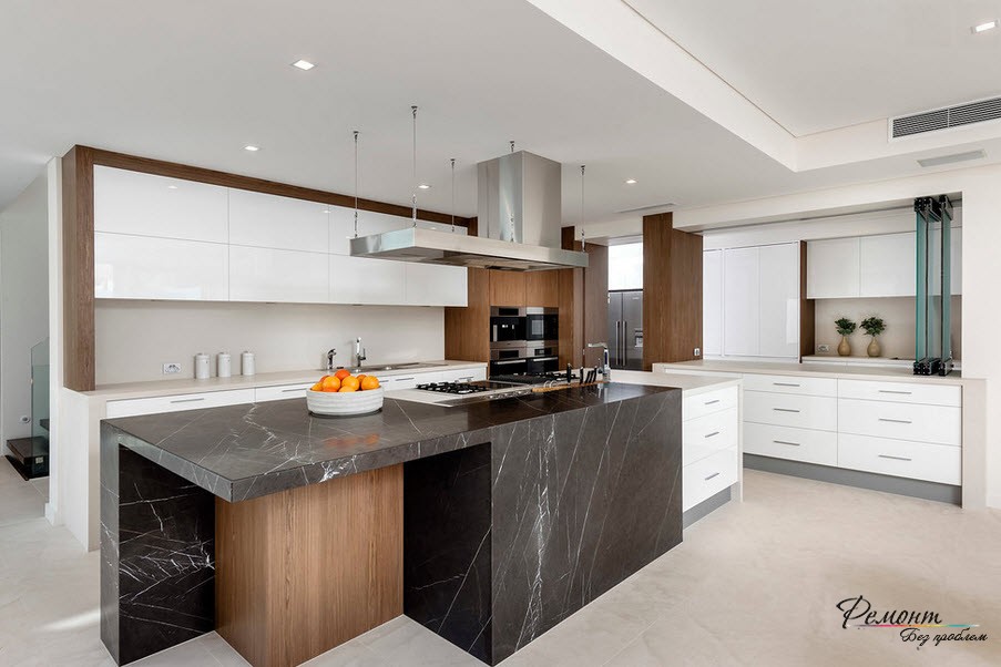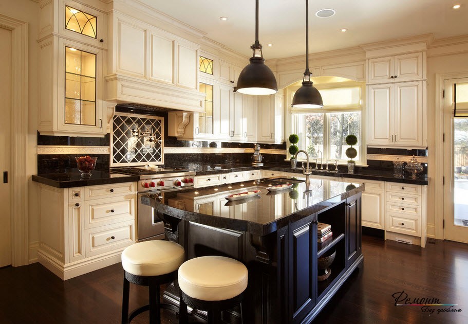 В классическом стиле остров можно украсить резными накладками, открытыми полочками, витражами. Столешницы могут быть глянцевыми или каменными (мраморными). Красиво и уместно в черно-белом или любом другом двухцветном интерьере кухни смотрится остров одного из интерьерных цветов: