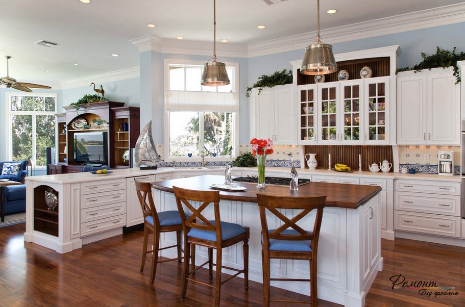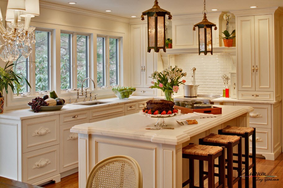 Кухня-остров, оформленная в различных стилях, − очень оригинальный способ оформления помещения. Можно подобрать дизайн острова в стиле прованс, дополнив интерьер другими декоративными стилевыми элементами (светильниками, вазами, шторами, плетеной мебелью):