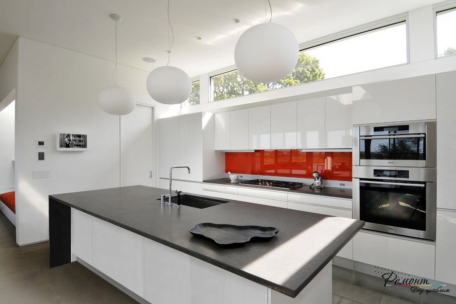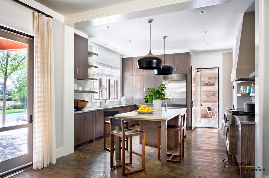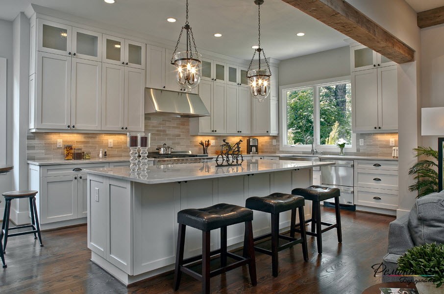 Организация полноценного освещения кухни с островом – это то, на что следует обратить внимание. Для общего освещения можно использовать встроенные и подвесные светильники. Для локального освещения острова наиболее подходящими будут объемные подвесные бра различной конфигурации: