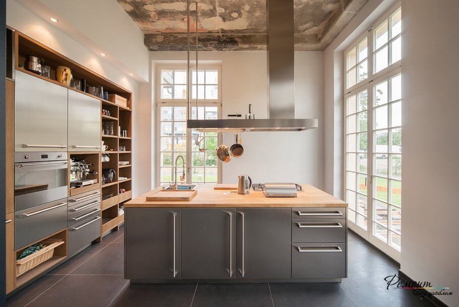 Если в островной конструкции вы хотите расположить варочную поверхность, нужно обязательно рассчитать возможность установки вытяжки и спроектировать способы подводки газовых коммуникаций. Вытяжка должна быть оборудована на соответствующей высоте и прочными креплениями: