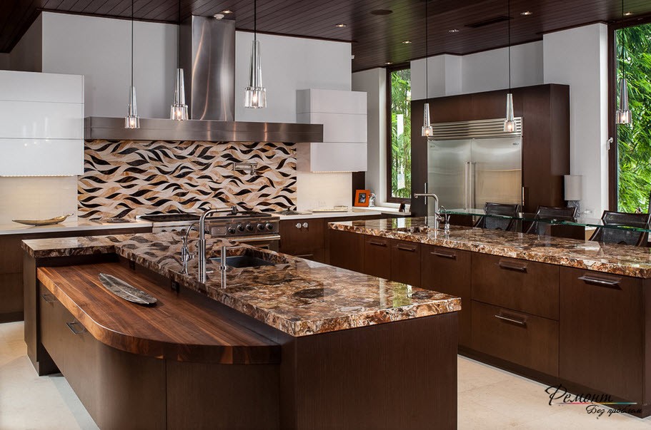 Помимо закругленной или волнообразной столешницы дизайнерским изыском станет двухъярусный остров. В верхнем ярусе удобно расположить мелкие предметы и малогабаритную посуду: