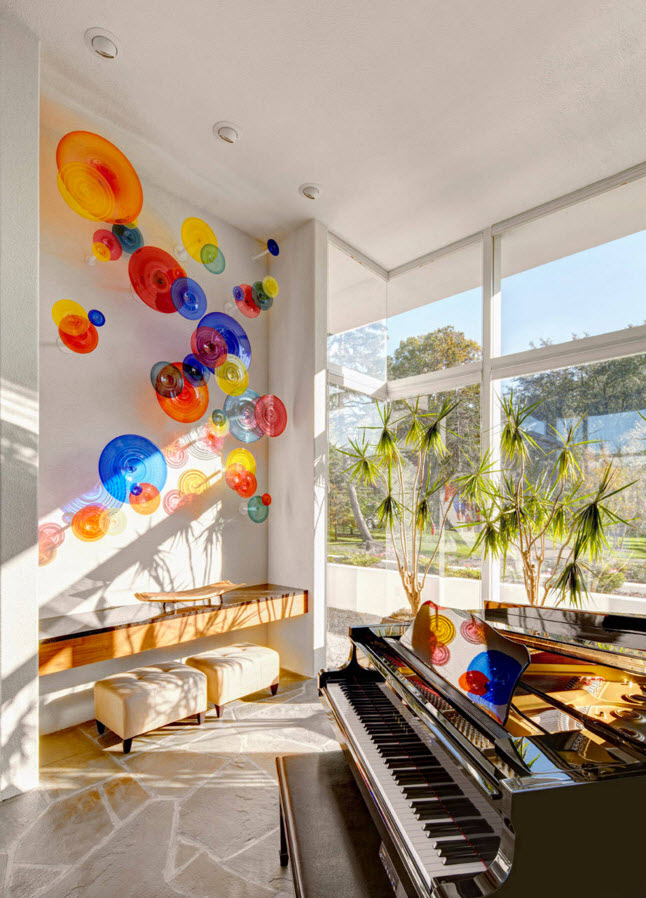 По-настоящему летнее настроение привнесут в интерьер помещения яркие стеклянные тарелки разных размеров. Размещенные на специальных штативах разной длины, несколько колоритных тарелок составляют оригинальную объемную композицию.