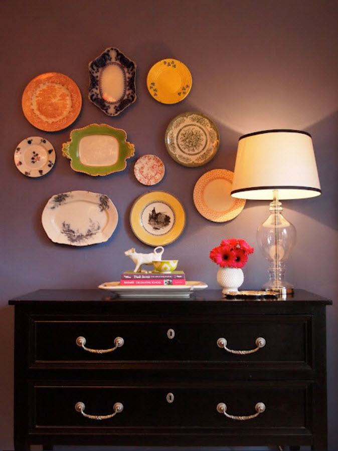 Над комодом или этажеркой, расположенной в коридоре или прихожей можно разместить композицию из тарелок разных форм, расцветок и размеров. На однотонной отделке стены такой декор будет выглядеть особенно эффектно.