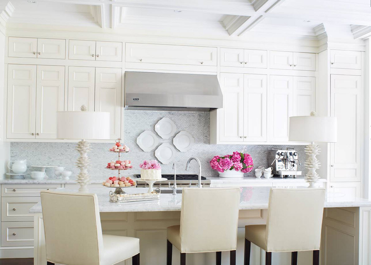 В традиционной кухне с белоснежным дизайном «кружевные» тарелки белого цвета в пространстве кухонного фартука смотрятся невероятно органично.