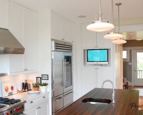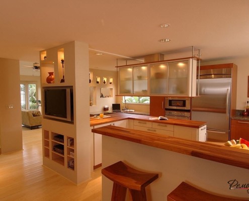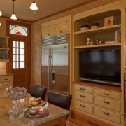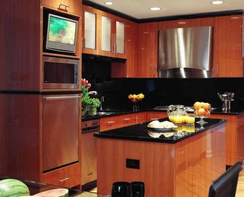 Для большой кухни спектр возможностей установки монитор и выбора модели значительно расширяется. Сюда можно поместить современный аппарат с диагональю от 24 до 36 дюймов. При этом следует учитывать, что качественное изображение на мониторе LCD можно получить, устанавливая его под определенным углом. При этом такие модели характеризуются приемлемой ценой. LED-телевизоры обеспечат отличное изображение под любым углом. Поэтому их можно без ограничений использовать в любом уголке кухни. Более узкий, чем у других, корпус позволяет легко найти такому прибору подходящее место. Единственная сложность, которая возникнет в установке большого телевизора, это невозможность встроить его в мебель. При этом бонусом могут быть дополнительные функции аппарата, такие как USB, DVD, Blu-Ray и другие.