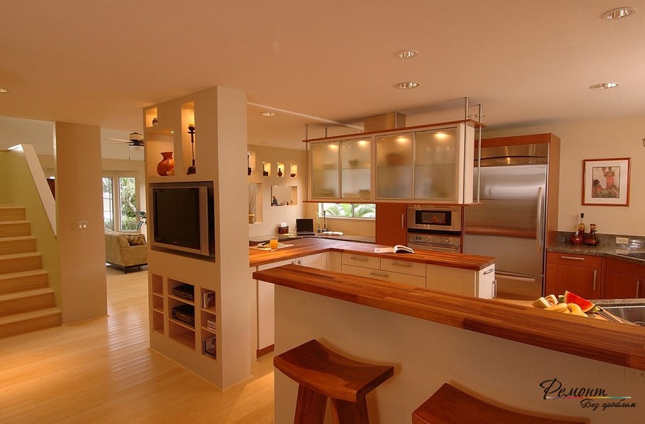 Чтобы органично вписать современный телевизор в интерьер кухни из натурального дерева или камня, можно использовать декоративные элементы из того же материала. Но главное помнить, что техника на кухне, прежде всего, нуждается в бережном отношении. Ее следует беречь от попадания воды, брызг масла и частиц пищи. Если соблюдать все меры предосторожности, то телевизор не только придаст кухне законченный вид, но и долгое время будет исправно выполнять свои функции.
