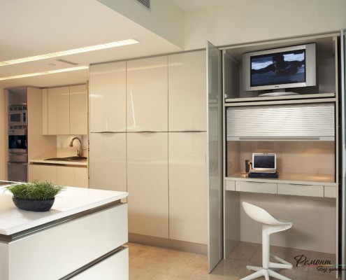 Одним из распространенных вариантов является высокое размещение телевизионного аппарата. Обычно его подвешивают прямо под потолком. Такое положение позволяет смотреть передачи тем, кто долго стоит на ногах. Лучшей точно для просмотра будет самый дальний угол. Для высокого размещения монитора подойдет поверхность холодильника или шкаф. В шкафу можно использовать раздвижные дверцы для того, чтобы прятать телевизор тогда, когда в нем нет нужды.