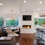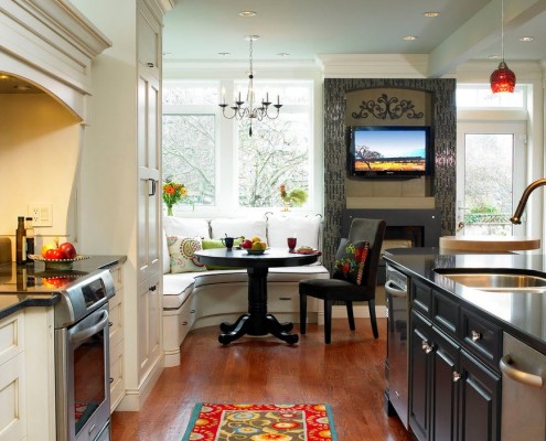 Оптимальным размещением для телевизора будет уровень глаз находящихся на кухне. Если большую часть времени все сидят за столом, то телевизор должен находиться там, где его удобно смотреть из сидячего положения. Такое расположение подойдет для кухни-столовой.