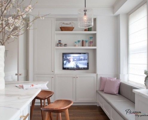 Идеальным местом для прибора может стать неглубокая ниша. Если ее заднюю стенку окрасить в основной цвет обстановки, то можно гармонично вписать телевизор в интерьер кухни. Нишу можно заменить полкой, на которой телевизор будет выглядеть не хуже. Такой дизайнерский ход отлично подойдет для кухни в классическом стиле.