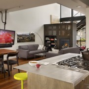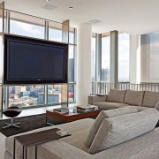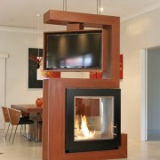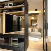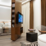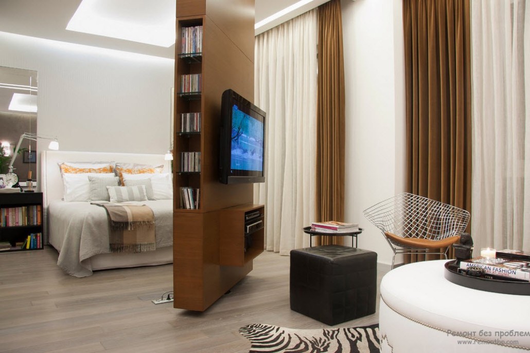 Конструкции перегородок могут не только разделять и зонировать помещение, но и служить отличным местом для телевизора. Если поместить его в поворотную сердцевину – можно смотреть один телевизор в нужной зоне.