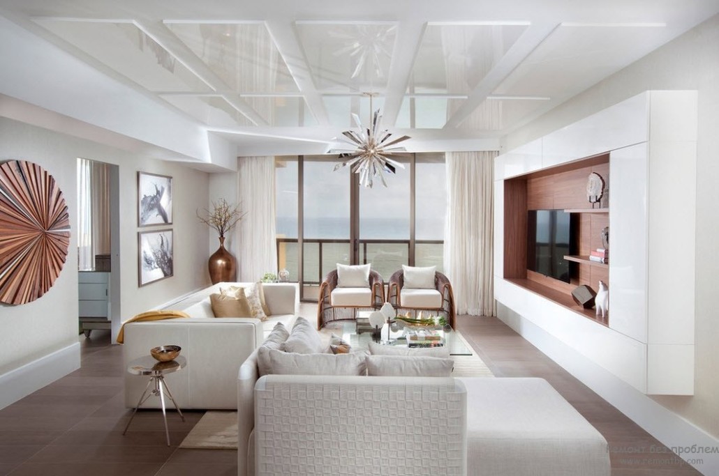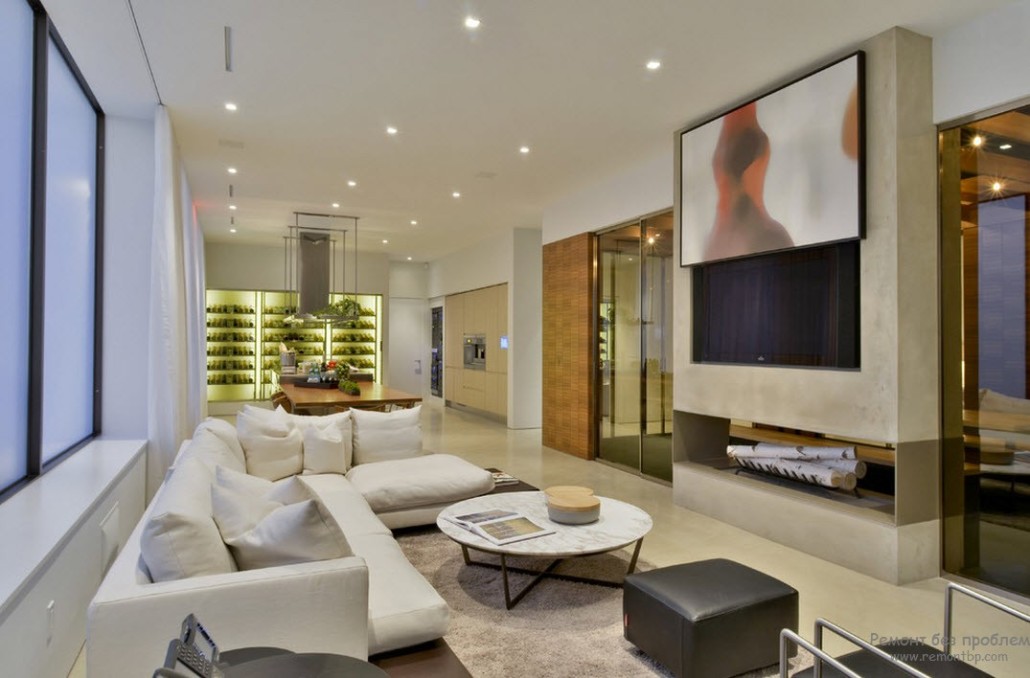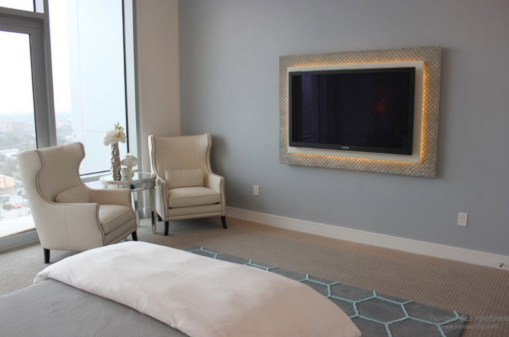 Техно, Хай-тек, Лофт, Минимализм. Так как эти стили современные, то в них учтено присутствие телевизора. Можно смело выделять его как угодно.