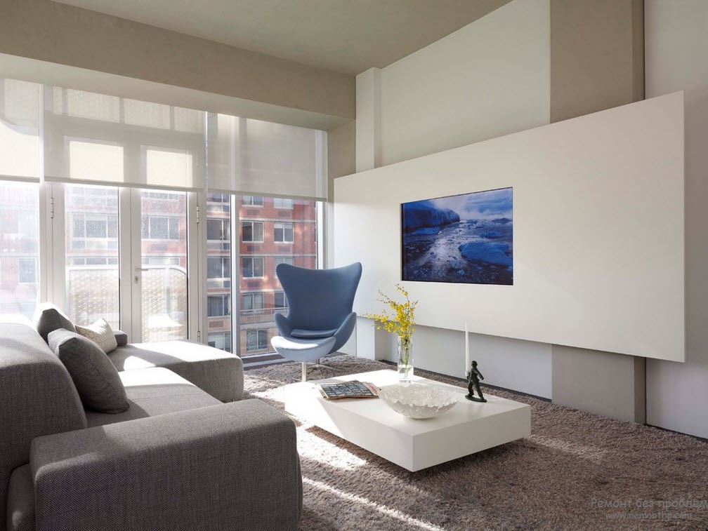 Телевизор можно спрятать за картинами, раздвижными панелями, дверьми шкафов-купе.