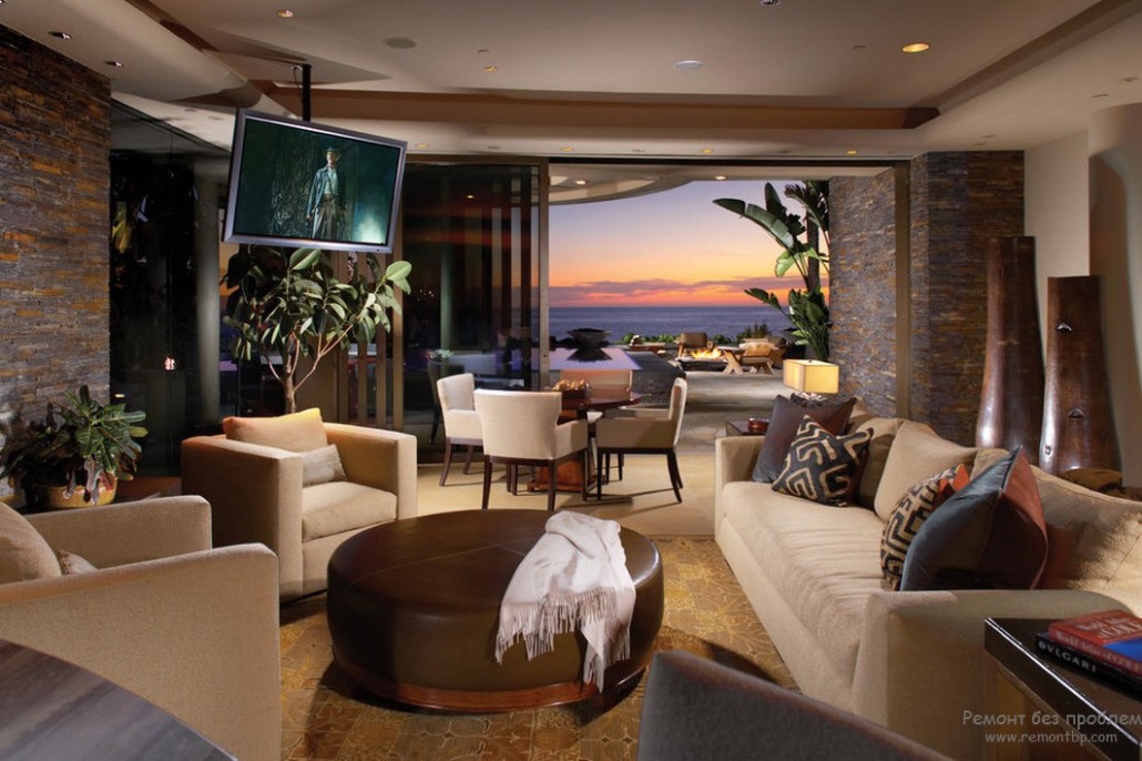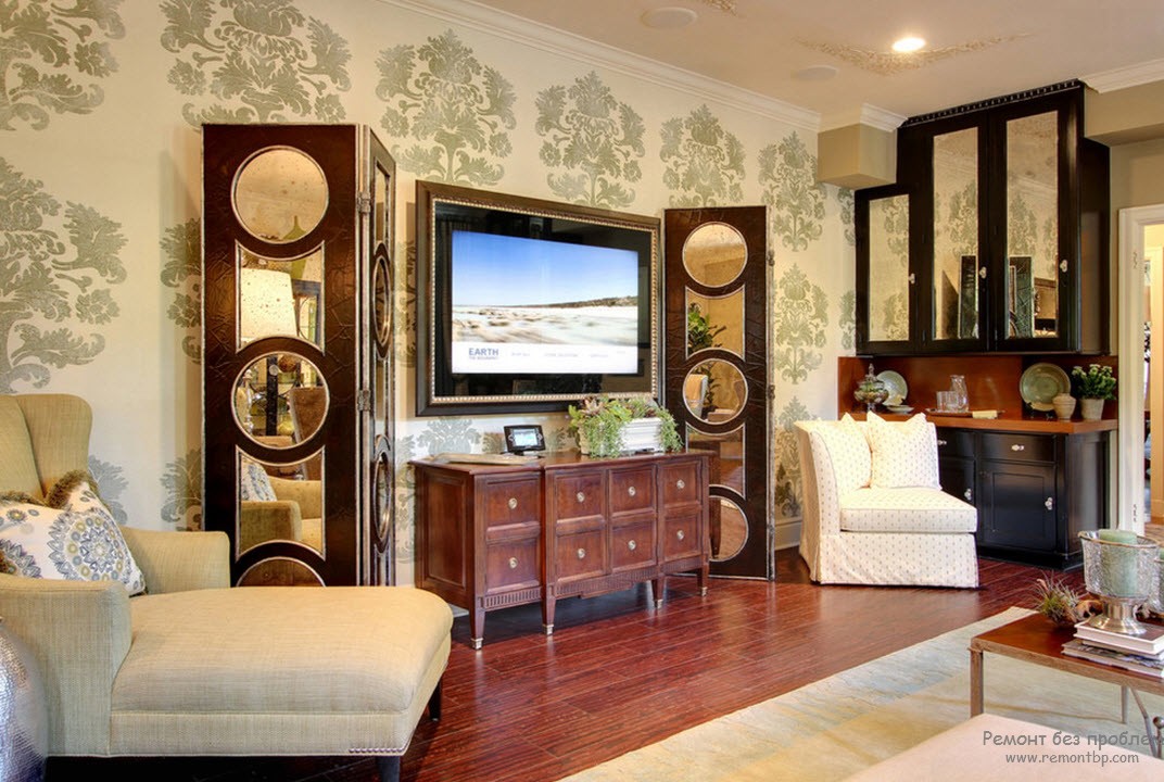 Африканский, Китайский, Индийский, Мексиканский стили. Во всех этих стилях телевизор лучше спрятать, В восточных стилях удобно прикрывать его бумажными панелями или ширмой. В Индийском стиле телевизор можно поместить в нишу. В Африканском – как в примитивном стиле, телевизор хорошо смориться на полу или на тумбе – барабане. В Мексиканском стиле телевизор можно повесить просто на стену, или также как и в Индийском разместить в нише украшенной орнаментом.