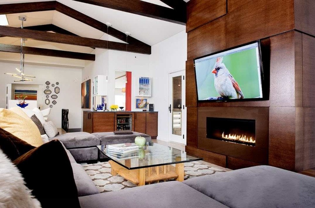 При расположении телевизора на стене появляется много вопросов по оформлению этой самой стены, чтобы интерьер из-за нее не казался пустым и незавершенным. В этом случае можно оформить стену вокруг телевизора или над ним полками. Поклеить обои разных фактур, таким образом можно визуально изменить размер помещения, например, расширить, сузить или вытянуть стену вверх. Можно выделить только зону телевизора. Для этого подойдут контрастные обои и панели, багетная рамка на стене, грубая кирпичная кладка, или даже паркетная доска. Главное, чтобы выбранный вами прием хорошо сочетался с основной стилистикой комнаты.