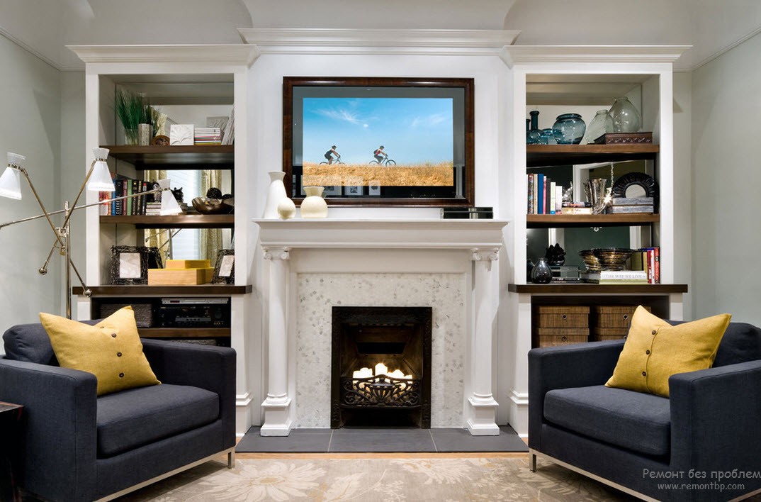 Телевизор отлично смотрится в нише, главное не забывать о том, что размер ниши не должен мешать свободной циркуляции воздуха у телевизора, иначе он может перегореть от перегревания. Поместив телевизор на выступе, вы не только обеспечиваете ему хорошую вентиляцию, но и можете красиво оформить по бокам выступа полками стеллажами,