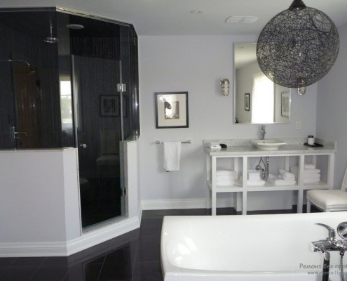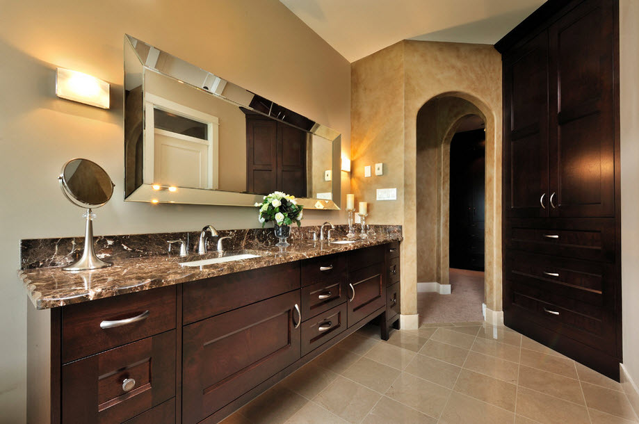 Но нередко можно встретить просторную ванную комнату с применением большого количества темного цвета. Если она правильно оформлена, то она не станет скучной или подавляющей. Здесь опытные дизайнеры советуют использовать зеркальные покрытия, для отражения света, которого должно быть достаточно при использовании множества светильников. Также можно сделать цветовой переход: темный них, более светлый верх и несколько светлых аксессуаров.