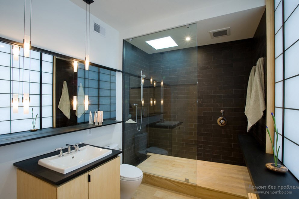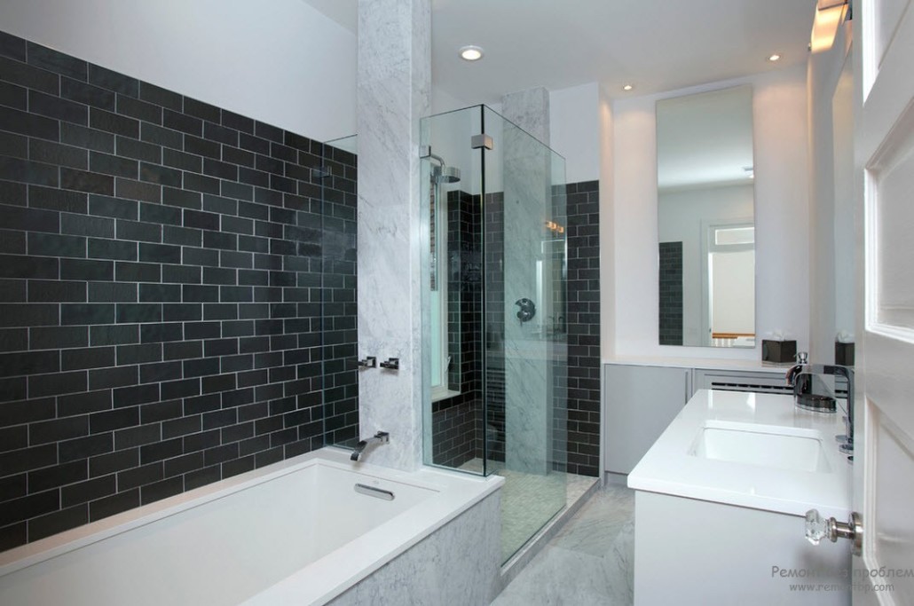 Но если ваша ванная комната имеет скромные размеры, то здесь следует быть еще более осторожными, так как черный цвет зрительно уменьшает пространство. Итак, чтобы не уменьшить уже маленькое помещение, следует использовать темные цвета в небольшом количестве, обильно разбавляя интерьер светлыми и даже белыми поверхностями.