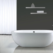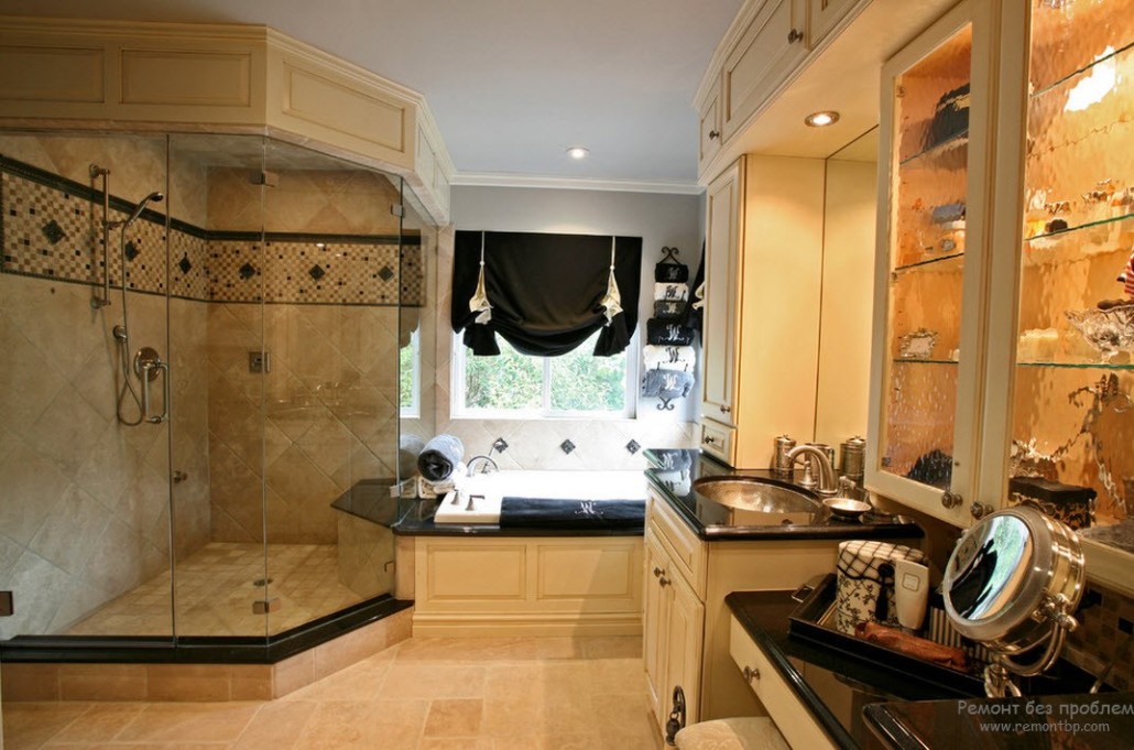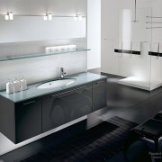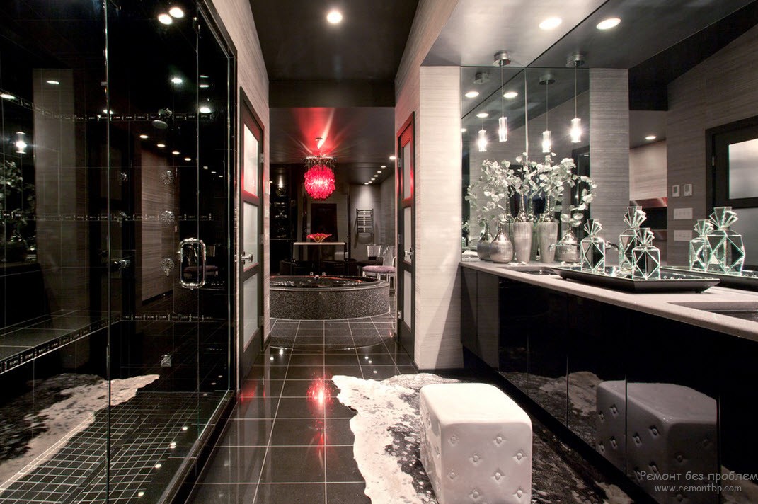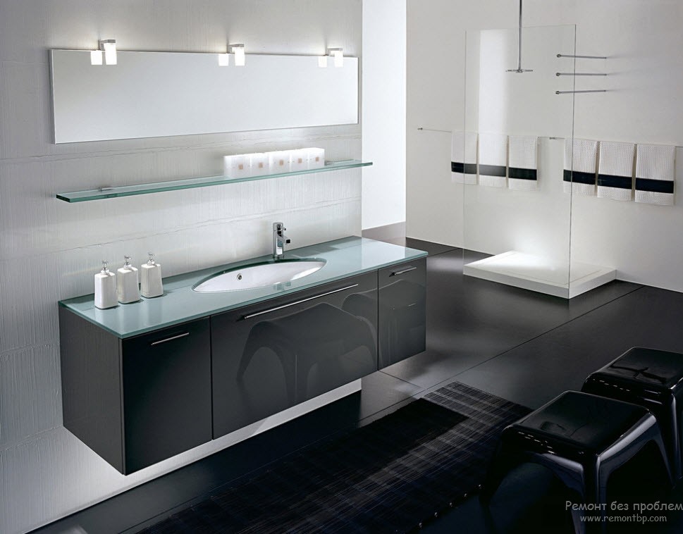 - Для начала, необходимо учитывать размер помещения. Если ванная комната большая и просторная, то смело используйте черные и другие темные цвета. Но все же не стоит злоупотреблять, все-таки слишком много темного в интерьере давит на психику человека. Используйте точечное распределение цвета, то есть черным может быть шкаф, ящики, экран для ванной, столешница и даже некоторые аксессуары, например, ваза и узор на ковре. А все остальное пусть будет другого цвета. Самым лучшим соседом черного, кстати, считается белый цвет, они великолепно контрастируют друг с другом. Как говорилось выше, нет света без тени, но и для того, чтобы увидеть тень, нам нужен свет.