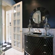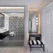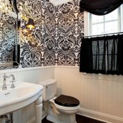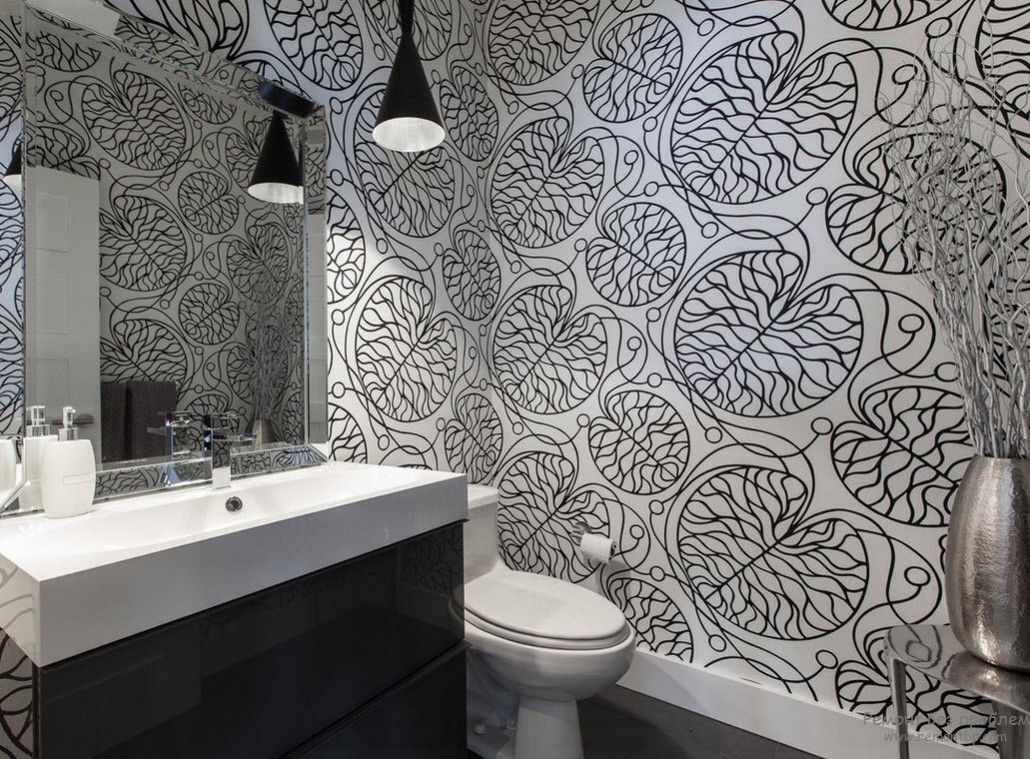 - Игра контрастов и теней, фактуры и рисунка. Для того чтобы создать неповторимую и уютную обстановку в темной ванной комнате, используйте контрасты, различные сочетания и вариации фактуры и рисунков. Сделав одну стену черной, украсьте ее интересным узором. Это сгладит мрачность и внесет в атмосферу тонки неповторимости и оригинальности.