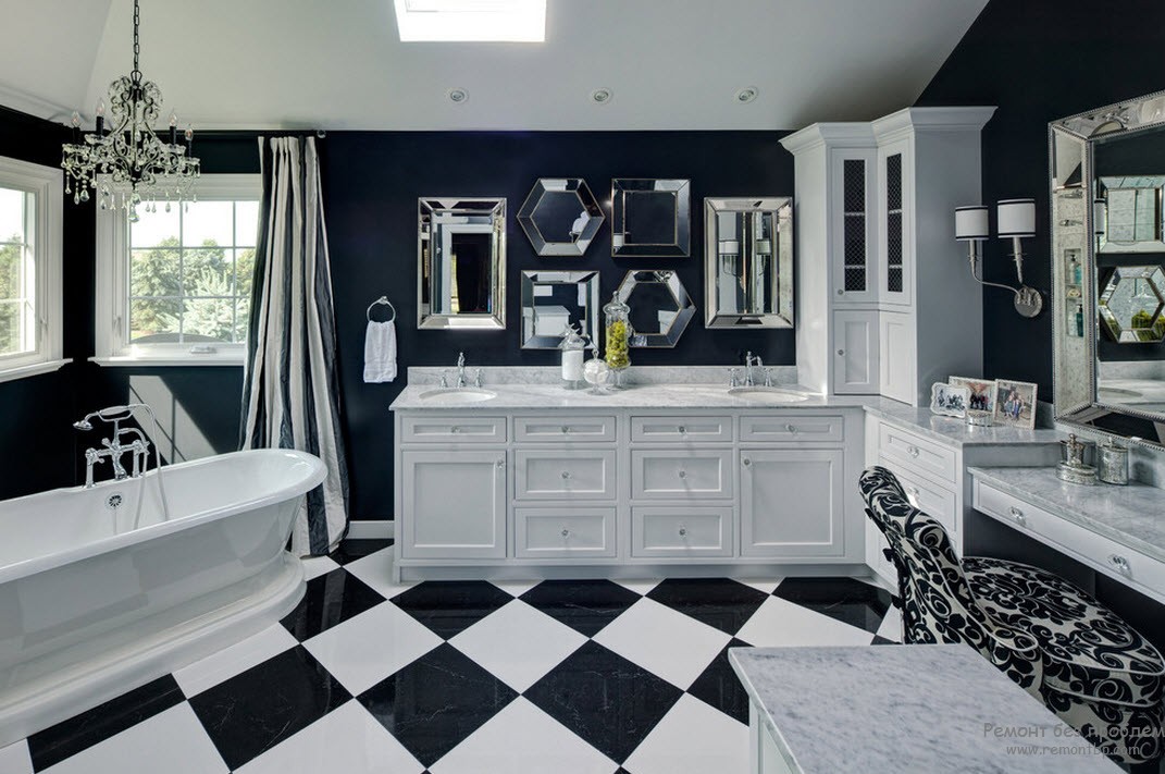 Шахматный рисунок на полу сделает вашу ванную интересной и освежит обстановку.