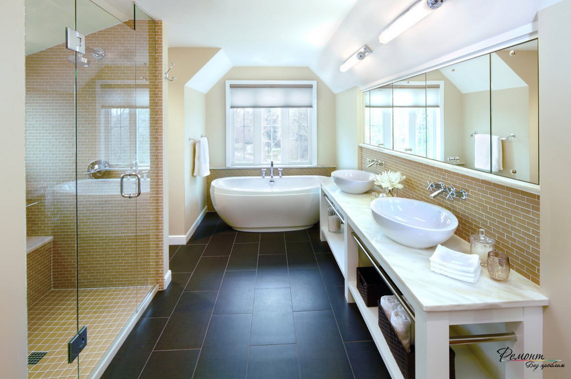 Любителям четких контрастов понравится идея черного пола в ванной: белая сантехника, кофейно-бежевый стены, деревянная мебель в теплых тонах и черная кафельная плитка на полу и на стене в душевой создадут оригинальный ансамбль. В такой ванной приятно будет зарядиться энергией перед работой и расслабиться после насыщенного дня. Оригинально будет смотреться черный пол и в ванной со светлым потолком и стенами.
