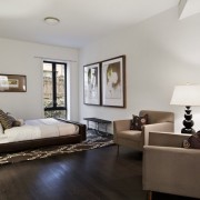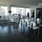 Основным достоинством темного, практически черного пола, является то, что все элементы мебели на нем выглядят очень эффектно, будь то простенькое кресло и журнальный столик или огромный кожаный диван.