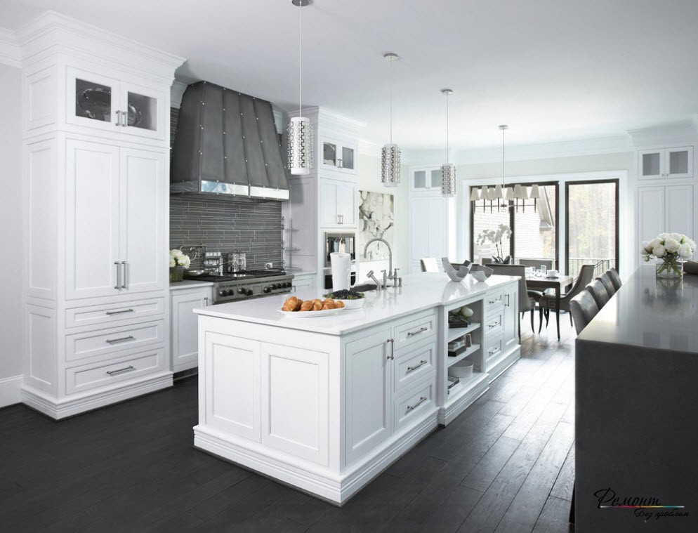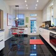 Черно-белая кухня – это классика, которой отдают предпочтение большинство людей, и именно в такой кухне черный пол является неотъемлемой частью. Самый практичный материал для напольного покрытия кухни – керамическая плитка или керамогранит. Если в кухне планируется кухонный гарнитур с матовыми фасадами, то использовать можно плитку с поверхностью без блеска, а если кухня глянцевая, то здесь идеально подойдет блестящий, практически зеркальный черный пол. Однако в таком случае нужно быть готовым постоянно его натирать, чтобы он производил нужный эффект.