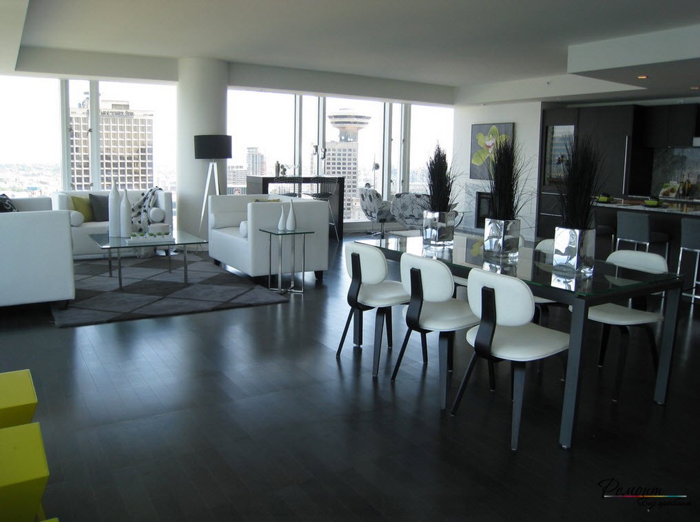 Темные тона напольного покрытия – это классический вариант оформления жилища, привычный для каждого из нас. Но вот черный пол для своей квартиры могут выбрать лишь смелые и уверенные в себе люди. Практически черный цвет пола четко описывает пространство, и создает опору для всего интерьера помещения. Комната с напольным покрытием в темных тонах не будет казаться пустой даже при минимальном количестве мебели. А правильное сочетание черного пола с остальными элементами интерьера помогут создать оригинальный дизайн квартиры. Именно о том, как оформить пространство квартиры с использованием темного напольного покрытия и пойдет речь.